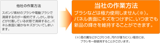 専用の薬品を散布してから高圧洗浄をします。もしくは、水のみ(純水)を使い低圧で洗浄をします。局部の汚れは手作業になります。パネルだけではなく設備全体の清掃も行います。
